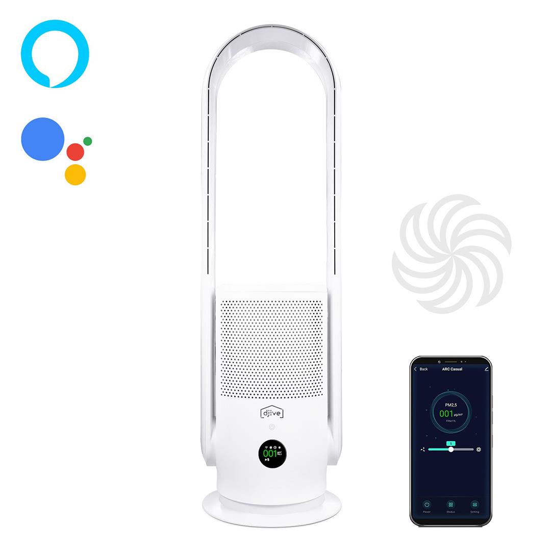 Djive ARC Casual on nutikas kombinatsioon värskendavast ventilaatorist ja hügieenilisest õhupuhastajast. Integreeritud UV-C steriliseerimine ja HEPA14 filter eemaldavad õhust peene tolmu, bakterid, viirused ja õietolmu vähem kui tunni jooksul, tagades seeläbi tervisliku kodukeskkonna. Seadme saab täielikult integreerida SmartHome süsteemidega ja seda saab juhtida kas rakenduse, Alexa ja Google Home hääljuhtimise, nutikate automatismide või isegi puldiga.