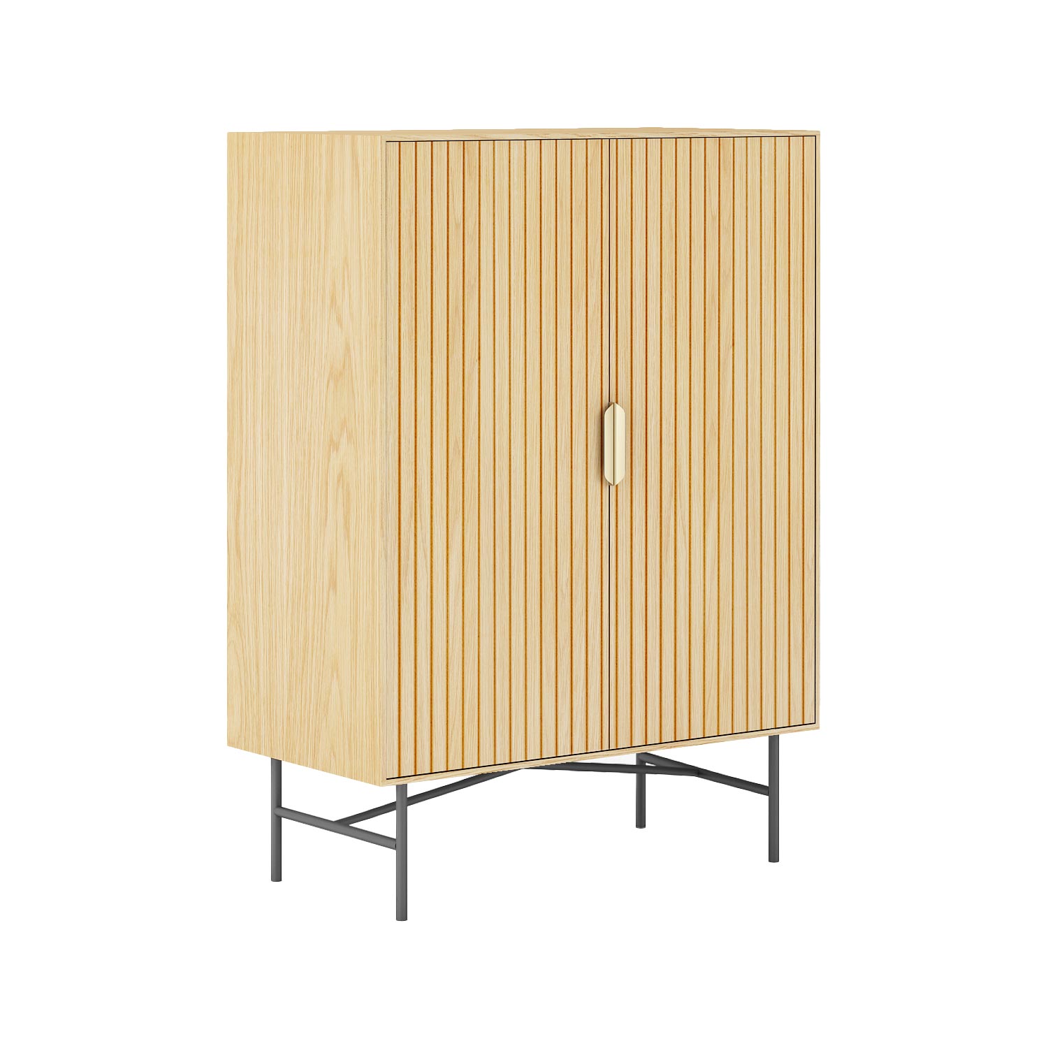 Kapp BASSEL 2-uksega 80x40xH110cm, 3D melamiin. Kapp on valmistatud heleda puidudekooriga melamiinplaadist. Ribilised uksepaneelid ja kuldsed käepidemed annavad kapile trendika välimuse. Metallist jalad ja alusraam on viimistletud musta pulbervärviga.