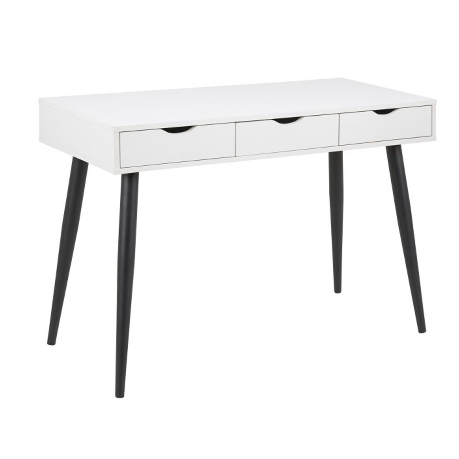 Kirjutuslaud NEPTUN 110x50xH77cm, valge/must. Kirjutuslaud on vajalik täiendus igas kodus, võimaldades mugavamalt arvutit kasutada või endale praktiline kodukontori ruum luua. Kirjutuslaual on kolm sahtlit, mis on metallsiinidel. Laud on valmistatud melamiinplaadist. Värvus on valge. Jalad on valmistatud musta värvi metallist. Toote mõõdud on 110x50xH77cm.