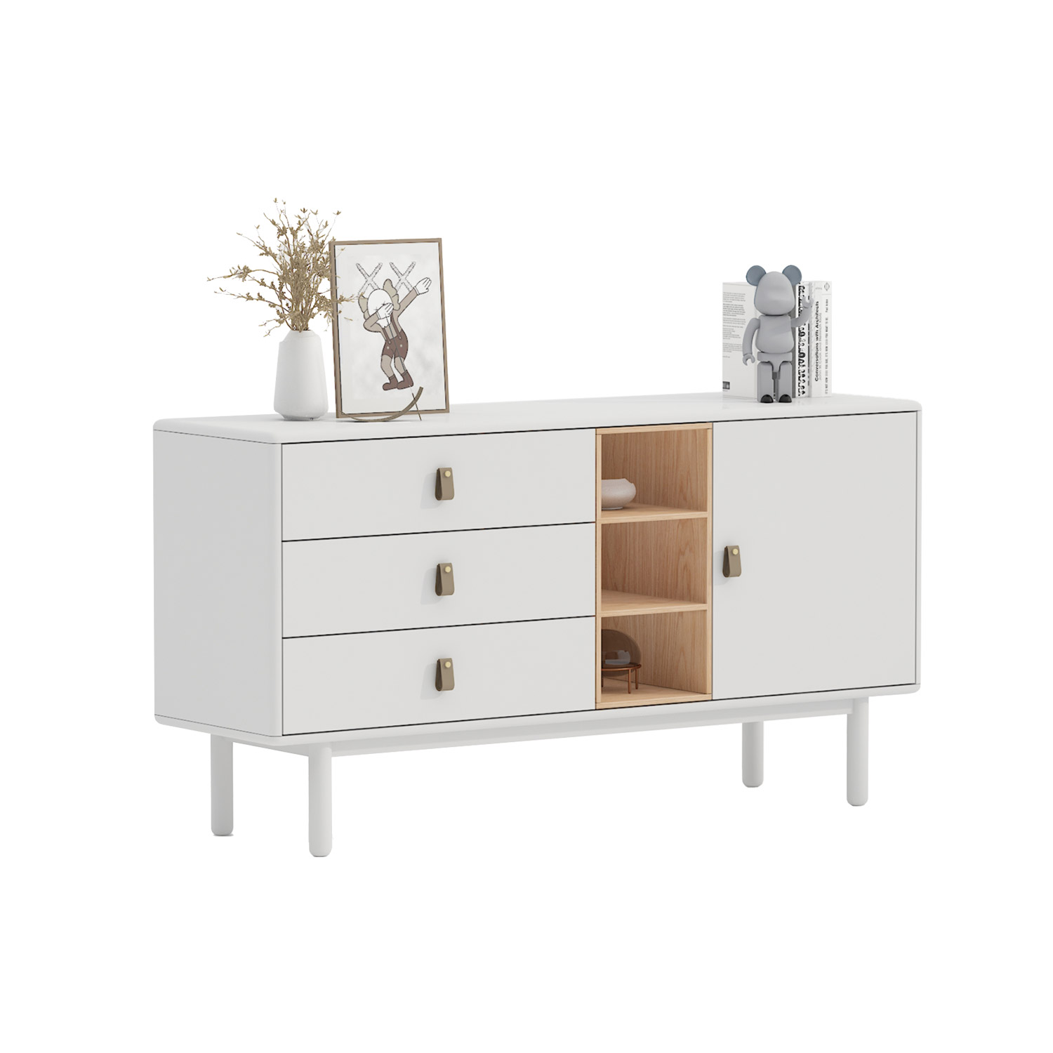 Kummut IRIS 3-sahtli ja uksega 140x40xH75cm, valge. Kummut on valmistatud 18mm MDF plaadist. Jalad ja alusraam on valmistatud täispuidust. Kummut on viimistletud vastupidava polüuretaanvärviga. Sahtlitel on nahast käepidemed. Avatud vaheriiul on vooderdatud heleda puiduvärvi plaadiga. Kummutil on ümarad välisservad.