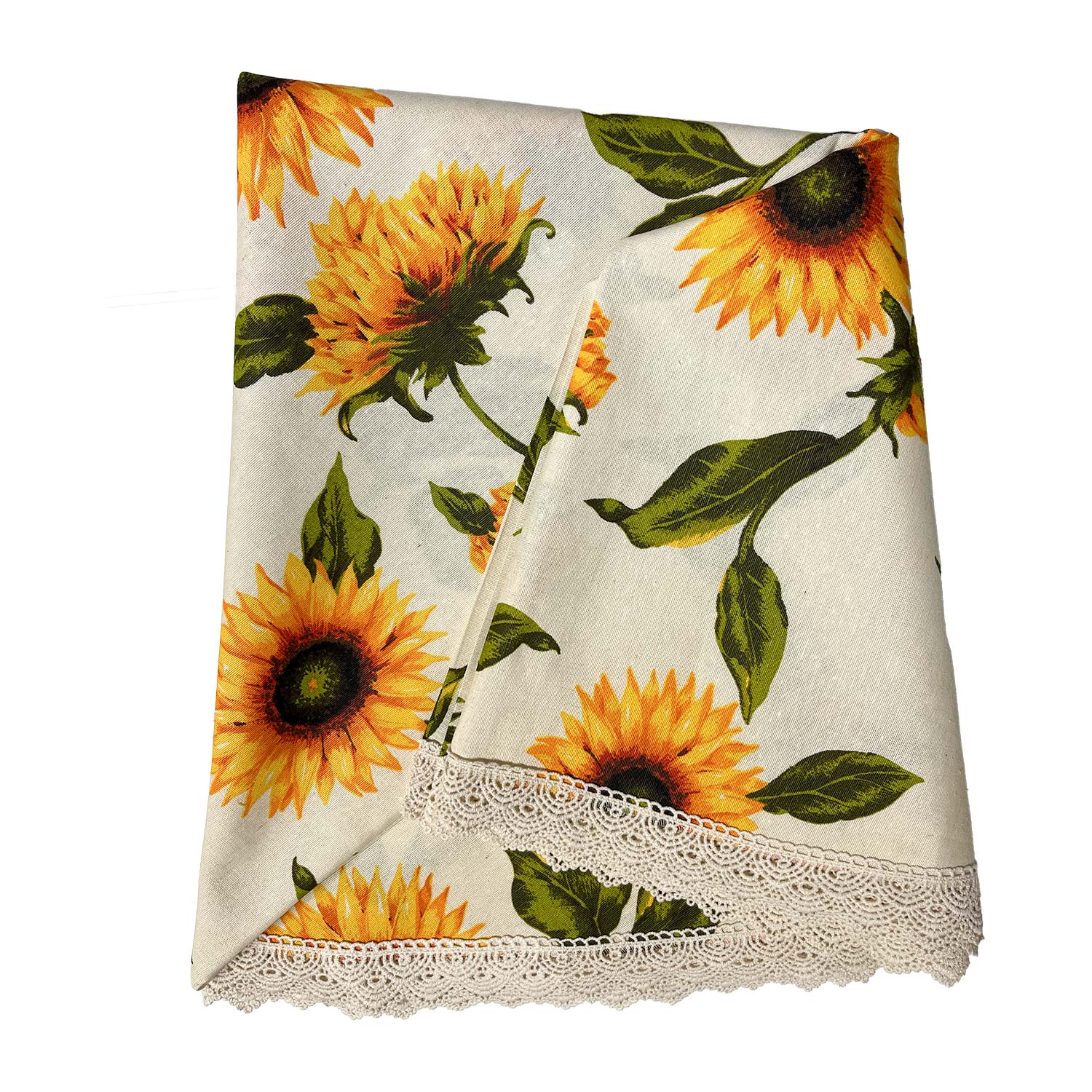 Laudlina LONETA NEW pitsiga, D170cm, päevalilled. 50% polüester, 50% puuvill, kangas 424. HOOLDUS: võib pesta temperatuuril 30 kraadi pesumasinas.