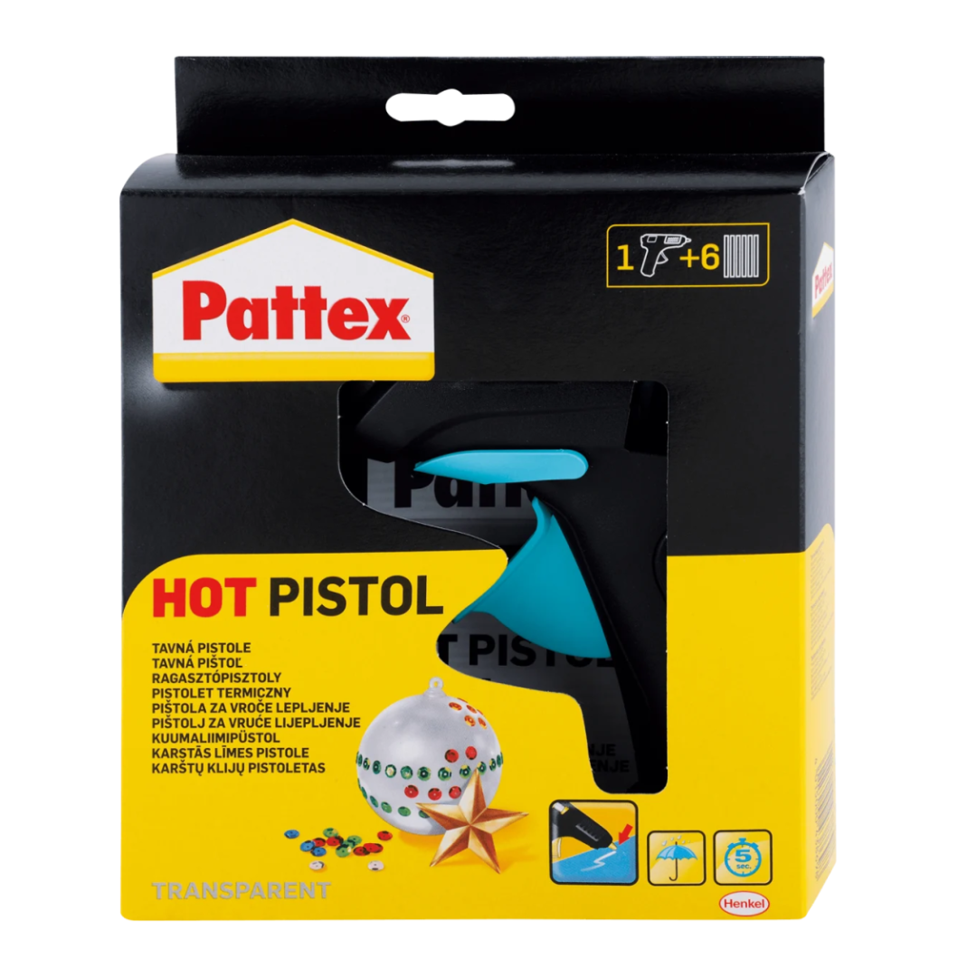 Pattex Hot on kuumliimipüstol ning läbipaistva koostisega kiireks ja püsivaks liimimiseks mõeldud kuumliimipulgad.