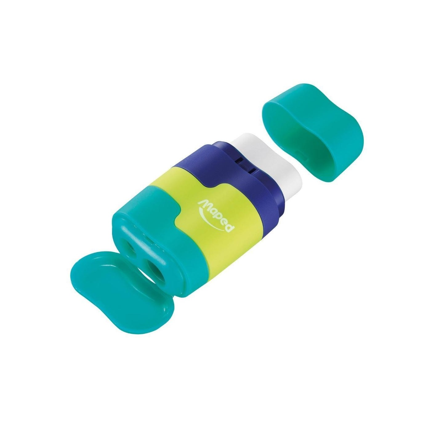 Lõbusates eredates värvides kaks-ühes kustukumm ja pliiatsiteritaja. Nii teritaja koos kogujaga kui kustukumm on kaitsekestaga. Ergonoomiline kuju muudab kasutamise mugavaks.