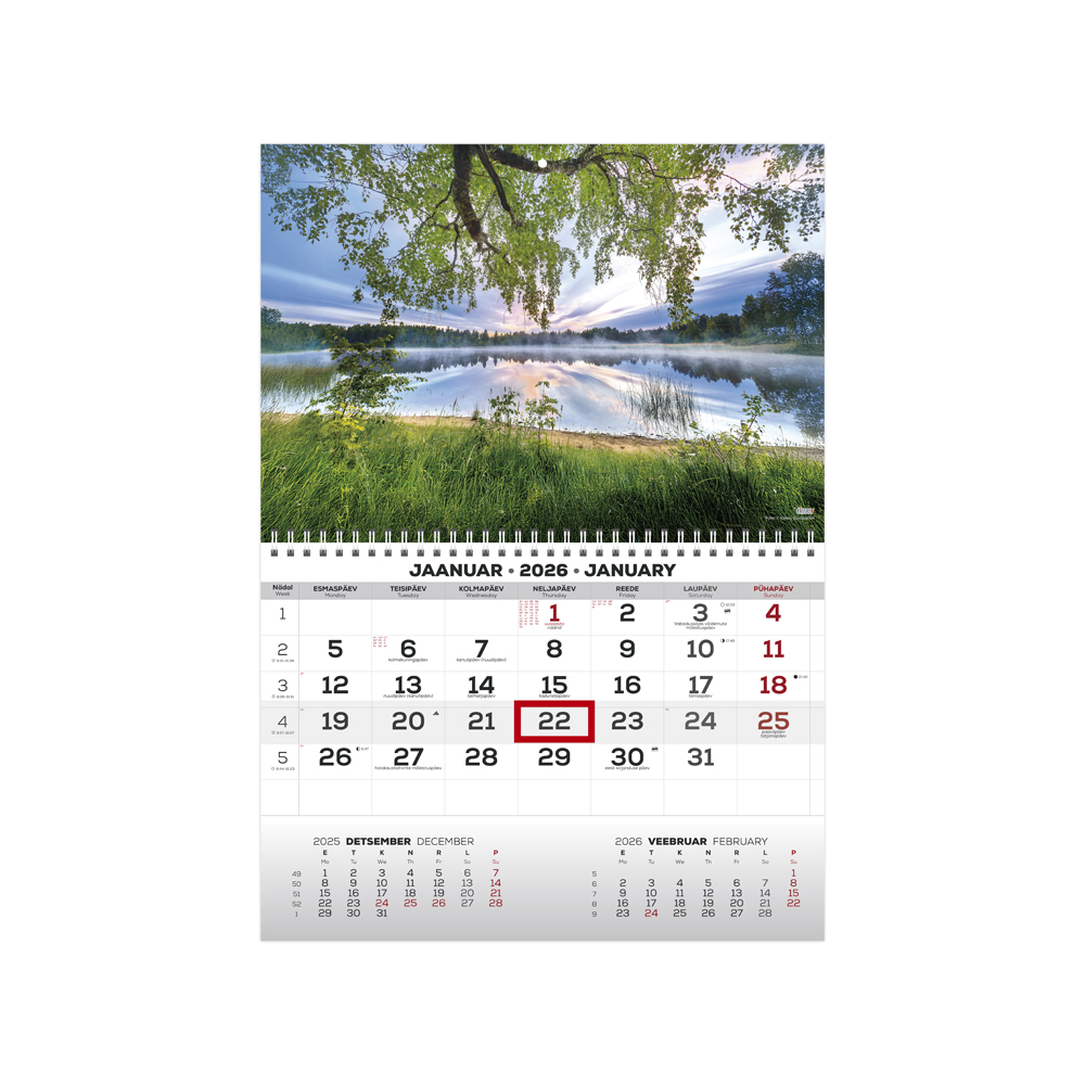 Mõõt: 297 x 420 mm Spiraalköide Riputusauk Sisu maht 12 lehte Kuupäevamärkija Sisu tumehall / punane Keel: eesti ja inglise Kalendaarium sisaldab järgmist: Riigipühad, riiklikud ja rahvakalendri tähtpäevad, lipupäevad, 37 riigi riigipühad lühenditega, suve- ja talveajale üleminek, päikese tõusu ja loojangu kellaajad (Tallinn), kuu faasid kellaaegadega, sodiaagimärgid, aastaaegade algused kellaaegadega, eelnev ja järgnev kuu, nädala number.