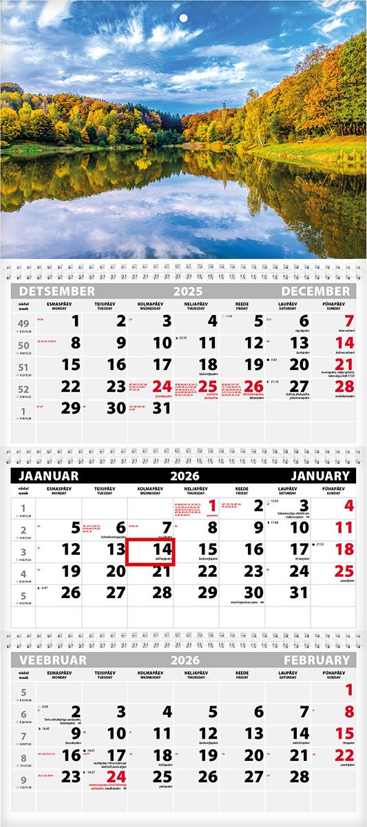Kolme kuu vaate ja kolme spiraaliga seinakalender. Avatud mõõt koos pildiga 297x640mm. Punane staatiline kuupäevamärkija. Kalendaarium sisaldab riigipühi, riiklikke ja rahvakalendri tähtpäevi, lipupäevi, 42 riigi pühi lühenditena, päikese tõusu ja loojangu aegu, kuu faase, aastaaegade alguseid. Päeva ja kuu nimed eesti ja inglise keeles. Tellides oma pildi ja/või reklaamribaga hind muutub.