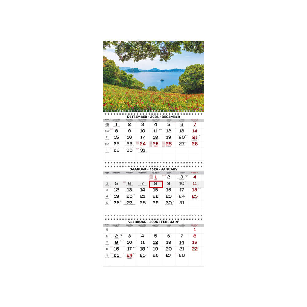 Mõõt: 297 x 650 mm Kolmeosaline spiraalköide Riputusauk Sisu maht 3 x 12 lehte Kuupäevamärkija Sisu tumehall / punane Keel: eesti ja inglise Kalendaarium sisaldab järgmist: Riigipühad, riiklikud ja rahvakalendri tähtpäevad, lipupäevad, 37 riigi riigipühad lühenditega, suve- ja talveajale üleminek, päikese tõusu ja loojangu kellaajad (Tallinn), kuu faasid kellaaegadega, sodiaagimärgid, aastaaegade algused kellaaegadega, eelnev ja järgnev kuu, nädala number.