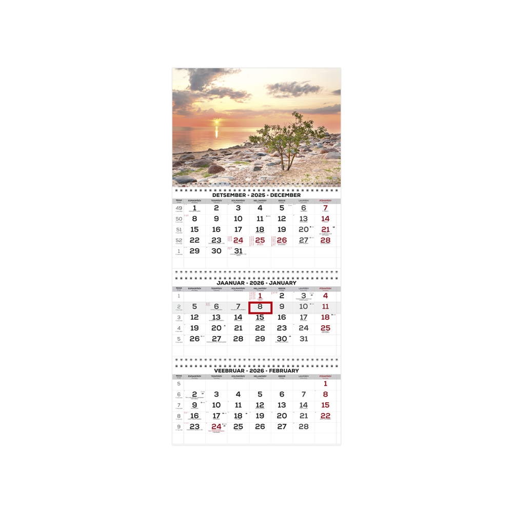 Mõõt: 297 x 650 mm Kolmeosaline spiraalköide Riputusauk Sisu maht 3 x 12 lehte Kuupäevamärkija Sisu tumehall / punane Keel: eesti ja inglise Kalendaarium sisaldab järgmist: Riigipühad, riiklikud ja rahvakalendri tähtpäevad, lipupäevad, 37 riigi riigipühad lühenditega, suve- ja talveajale üleminek, päikese tõusu ja loojangu kellaajad (Tallinn), kuu faasid kellaaegadega, sodiaagimärgid, aastaaegade algused kellaaegadega, eelnev ja järgnev kuu, nädala number.