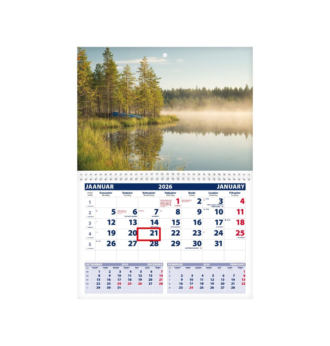 Kuuvaatega seinakalender. Avatud mõõt koos pildiga 297x425mm. Punane staatiline kuupäevamärkija. Kalendaarium sisaldab riigipühi, riiklikke ja rahvakalendri tähtpäevi, lipupäevi, 42 riigi pühi lühenditena, päikese tõusu ja loojangu aegu, kuu faase, aastaaegade alguseid. Eelmine ja järgnev kuu alati avatud. Päeva ja kuu nimed eesti ja inglise keeles. Tellides oma pildi ja/või reklaamribaga hind muutub.