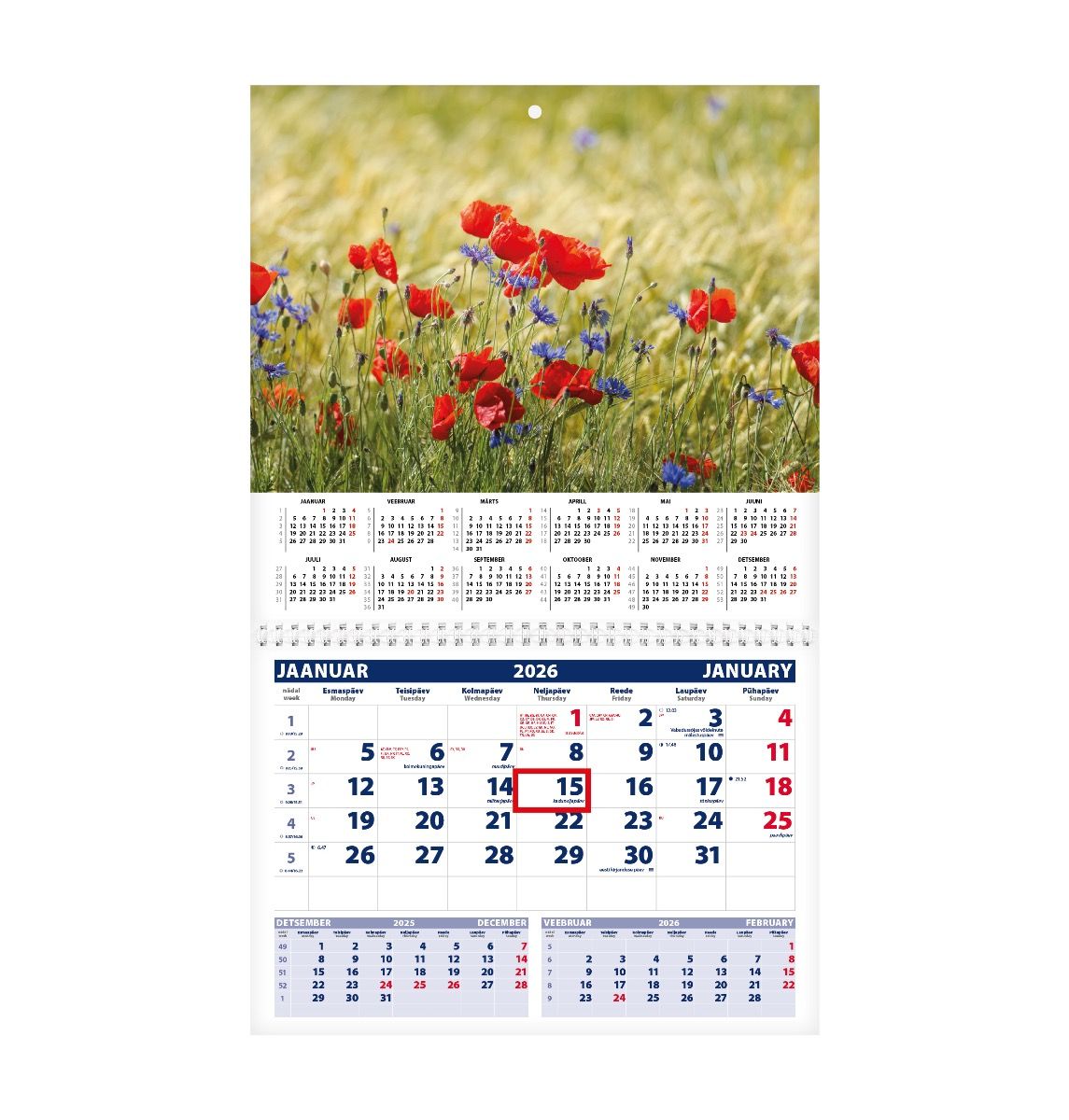 Kuuvaatega seinakalender. Avatud mõõt koos pildiga 297x425mm. Punane staatiline kuupäevamärkija. Kalendaarium sisaldab riigipühi, riiklikke ja rahvakalendri tähtpäevi, lipupäevi, 42 riigi pühi lühenditena, päikese tõusu ja loojangu aegu, kuu faase, aastaaegade alguseid. Eelmine ja järgnev kuu alati avatud. Päeva ja kuu nimed eesti ja inglise keeles. Tellides oma pildi ja/või reklaamribaga hind muutub.