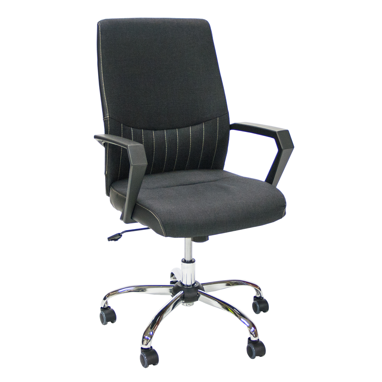 Töötool ANGELO must. Tooli polsterdatud iste ja seljatugi on kaetud musta polüesterkangaga. Käetoed on valmistatud plastikust. Toolil on kiikemehhanism. Istme kõrgus on reguleeritav gaasamordi abil. Toolil on 5-haruline kroomitud terasest jalarist ja põrandat säästvad rattad. Tooli üldmõõdud on 58x59xH97-105cm. Istme kõrgus 43-51cm, istme laius 49cm, istme sügavus 48,5cm, seljatoe kõrgus 56cm. Kaalupiirang 120kg.